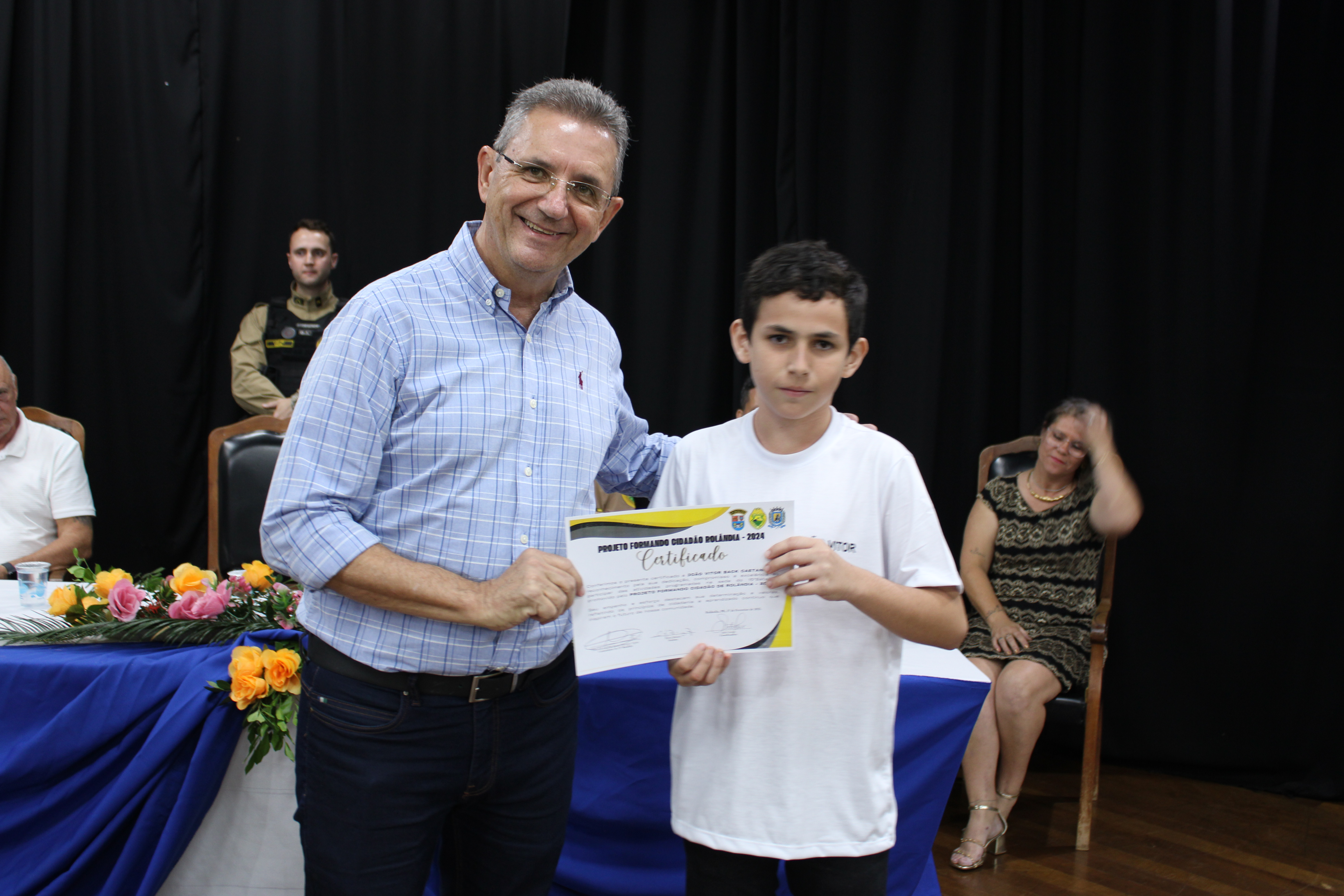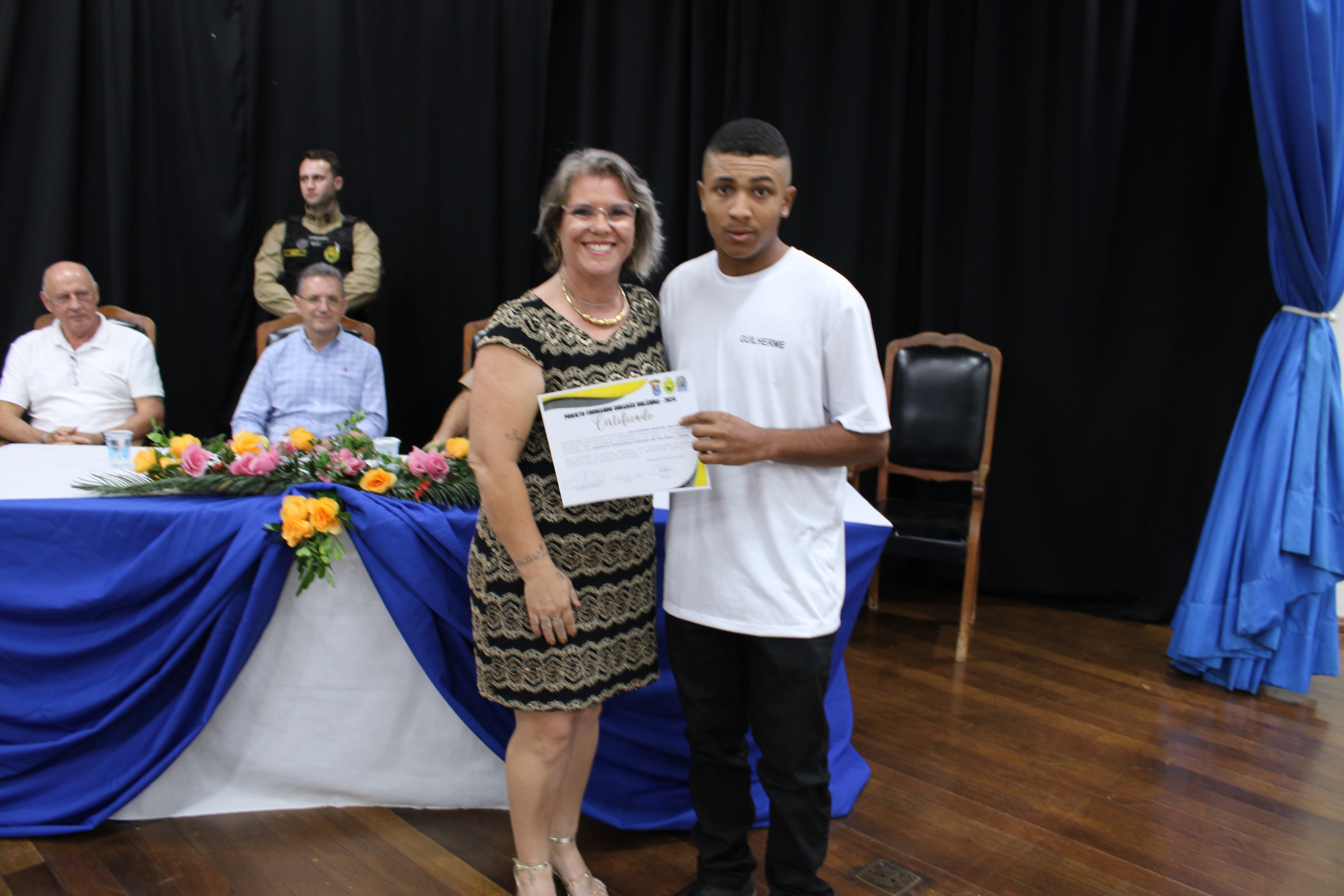 O vice-prefeito Horácio Negrão representou o prefeito Ailton Maistro no ato, que contou ainda com as presenças da secretária de Educação, Leise Camargo, de Sirlei Gomes (coordenadora do evento), dos vereadores Guilherme Spanguemberg – presidente da Câmara, Rodrigão, Ronaldo Bifinho e Gesiel Araújo; do empresário Devanir Peres, dos alunos e seus familiares e convidados.