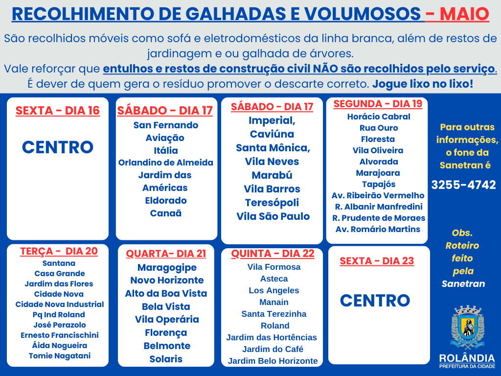 As Secretarias de Serviços Públicos e de Agricultura e Meio Ambiente informam que a empresa terceirizada que presta serviço ao município, a SANETRAN, passa recolhendo volumosos deixados na calçada (móveis como sofá e eletrodomésticos da linha branca), além de restos de jardinagem e ou galhada de árvores.