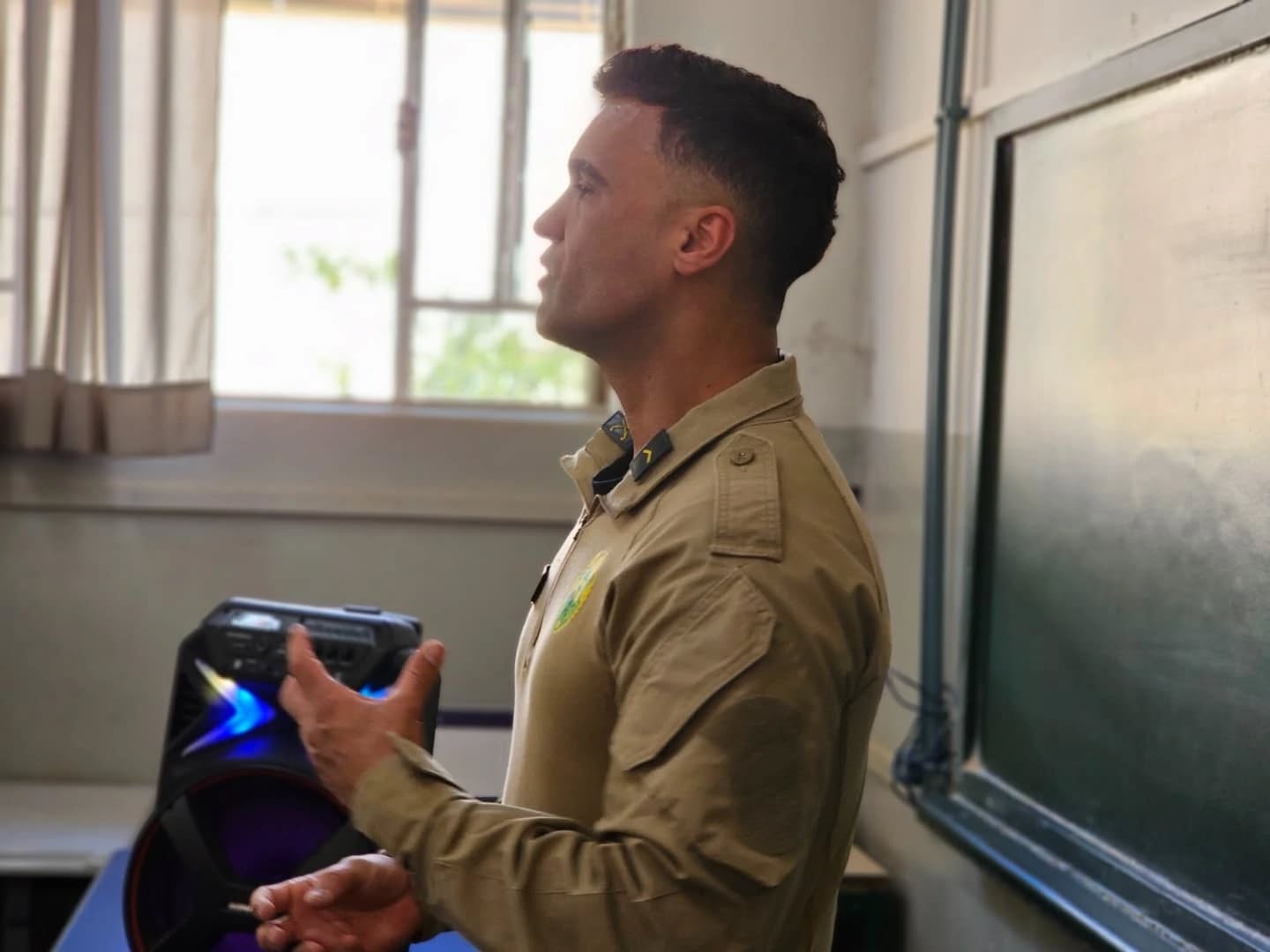 Imagens da escola municipal Dr. Vitório Franklin, centro, com o soldado Mendes ensaiando a turma para a formatura.