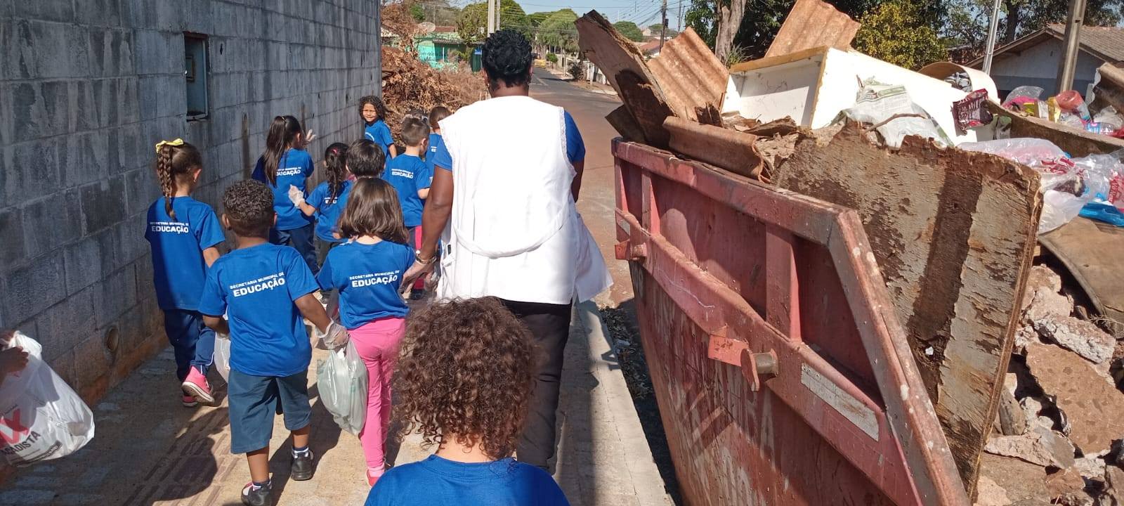 Como prática, a professora planejou um passeio ao entorno do espaço, para observarem e também recolher alguns lixos descartáveis que eles vissem pelas ruas.