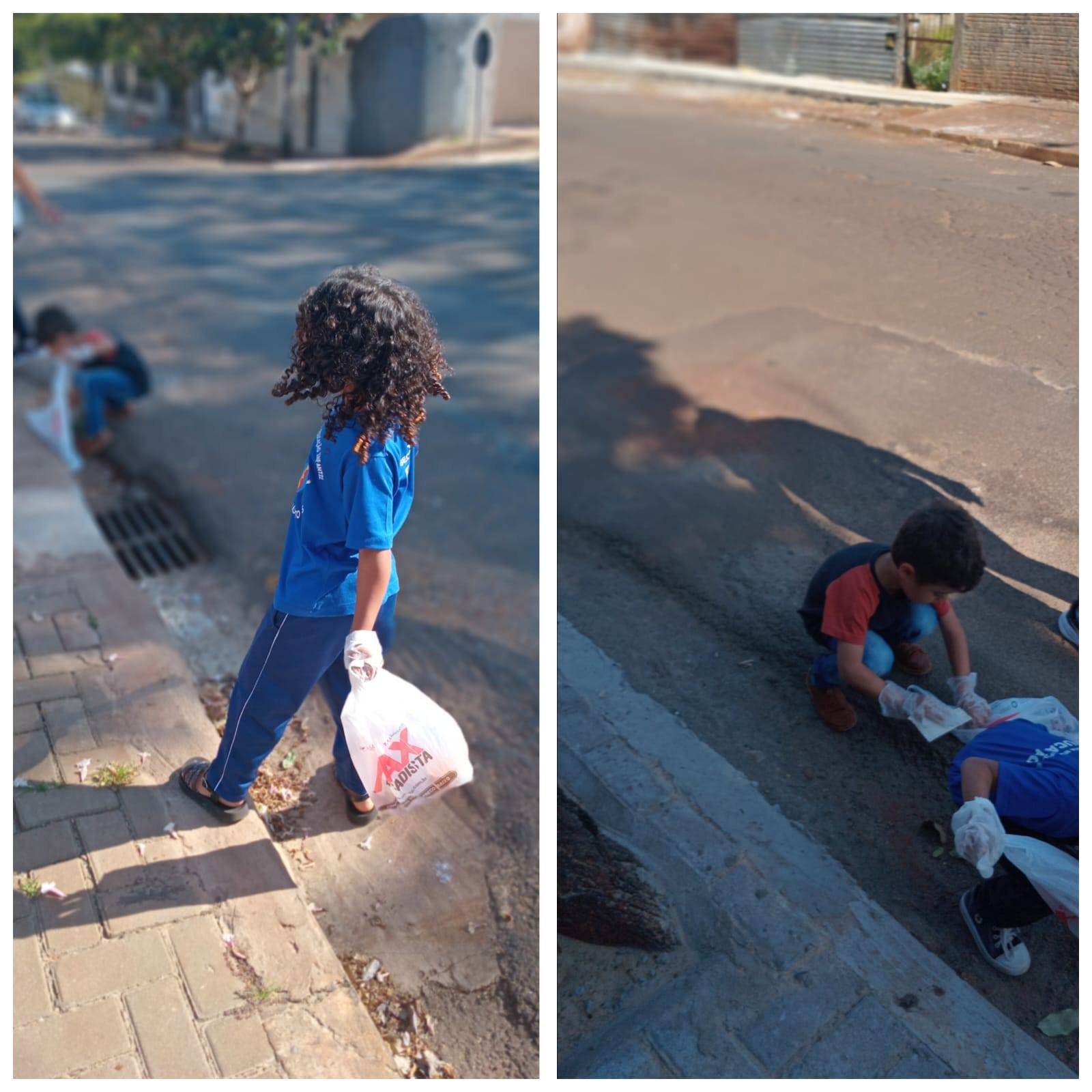 Todas as crianças levaram uma sacolinha plástica e usaram luvas de proteção para poderem recolher papéis, plásticos e latinhas que eles encontrassem pelo caminho.