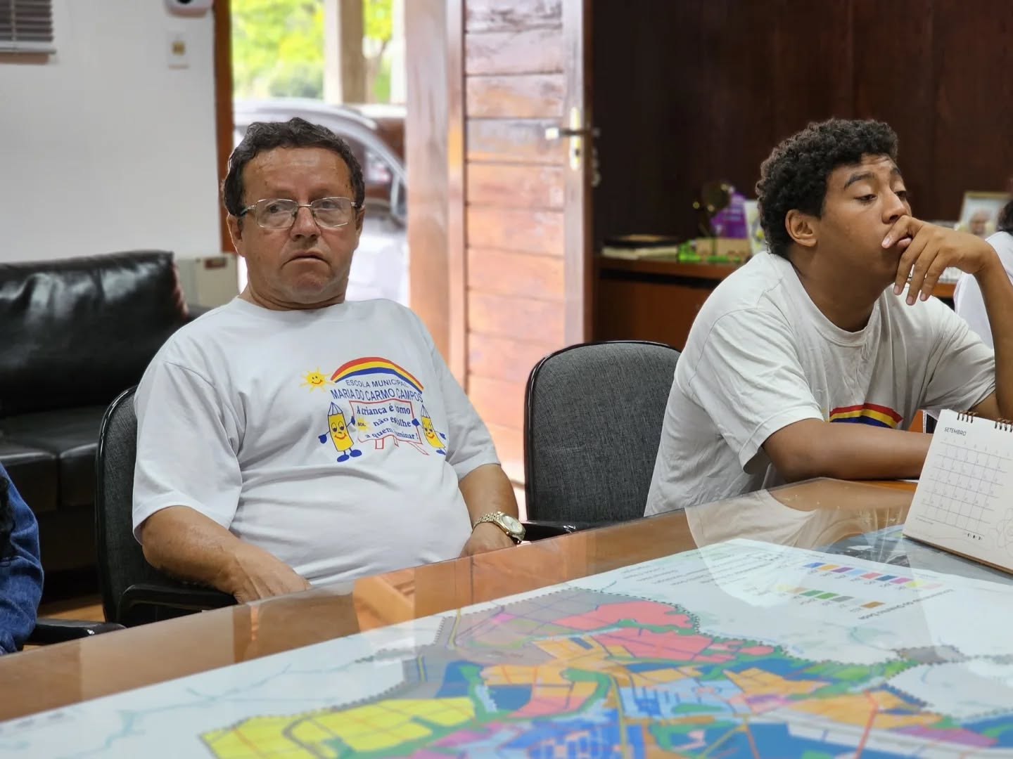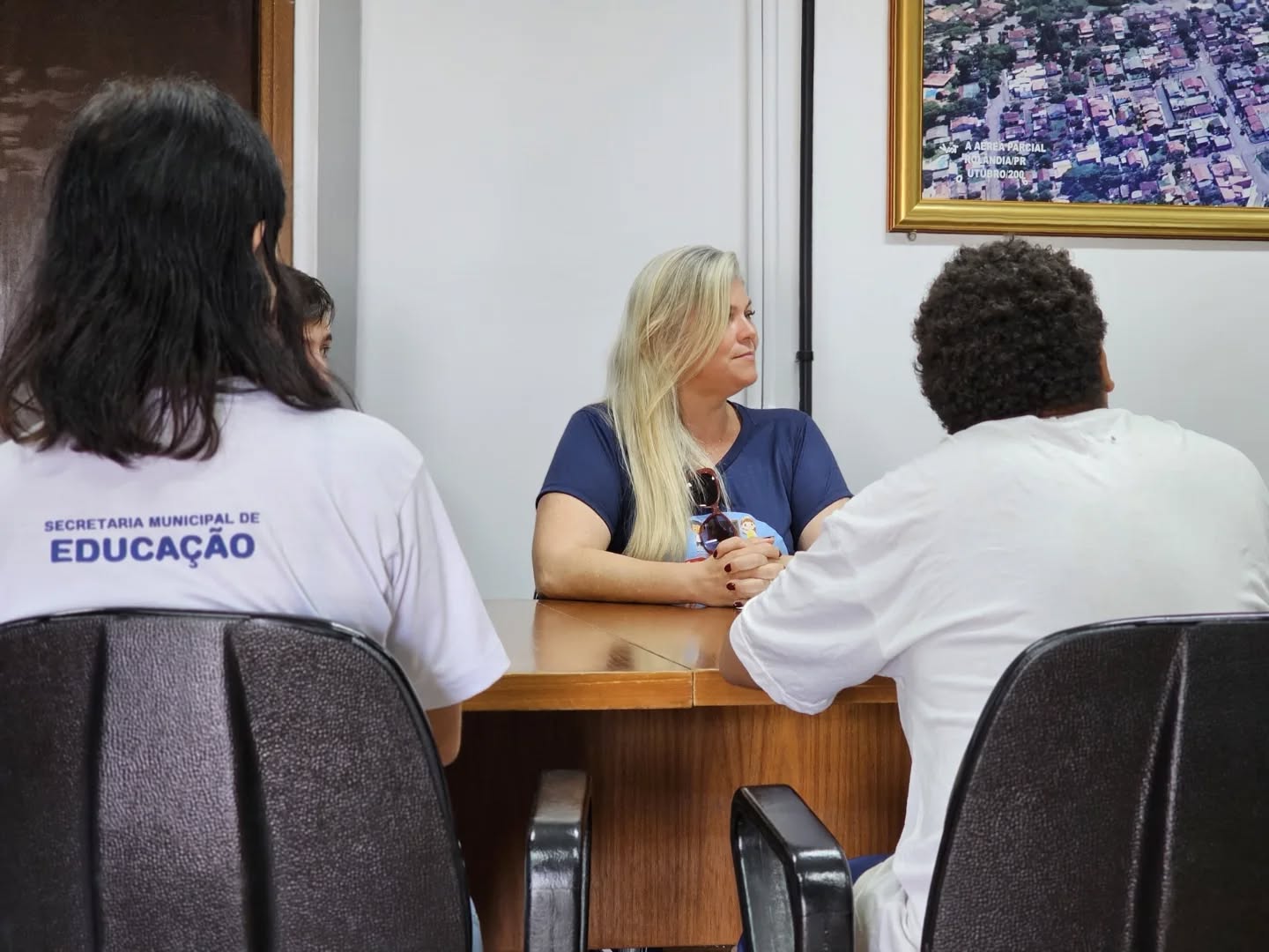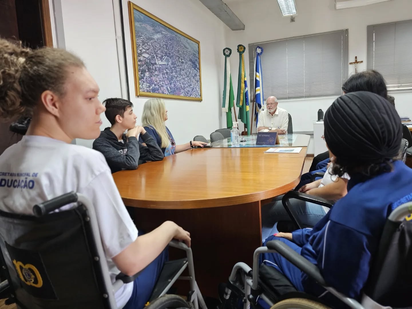 A professora Regina Naves está lecionando sobre os Poderes Constituídos e os alunos Bruno, Nataly, José, Luciana, Maria, Wesley e Pietra, junto com a cuidadora Márcia, vieram conhecer o Poder Executivo do Município, e foram recebidos pelo prefeito Ailton Maistro.