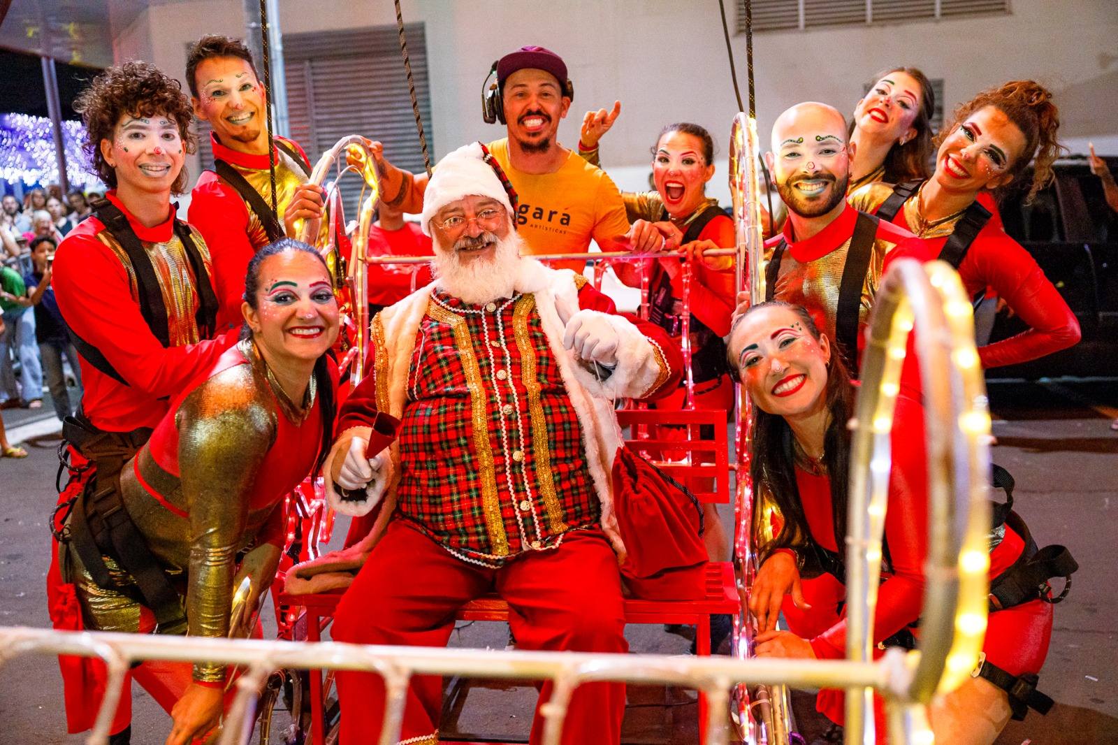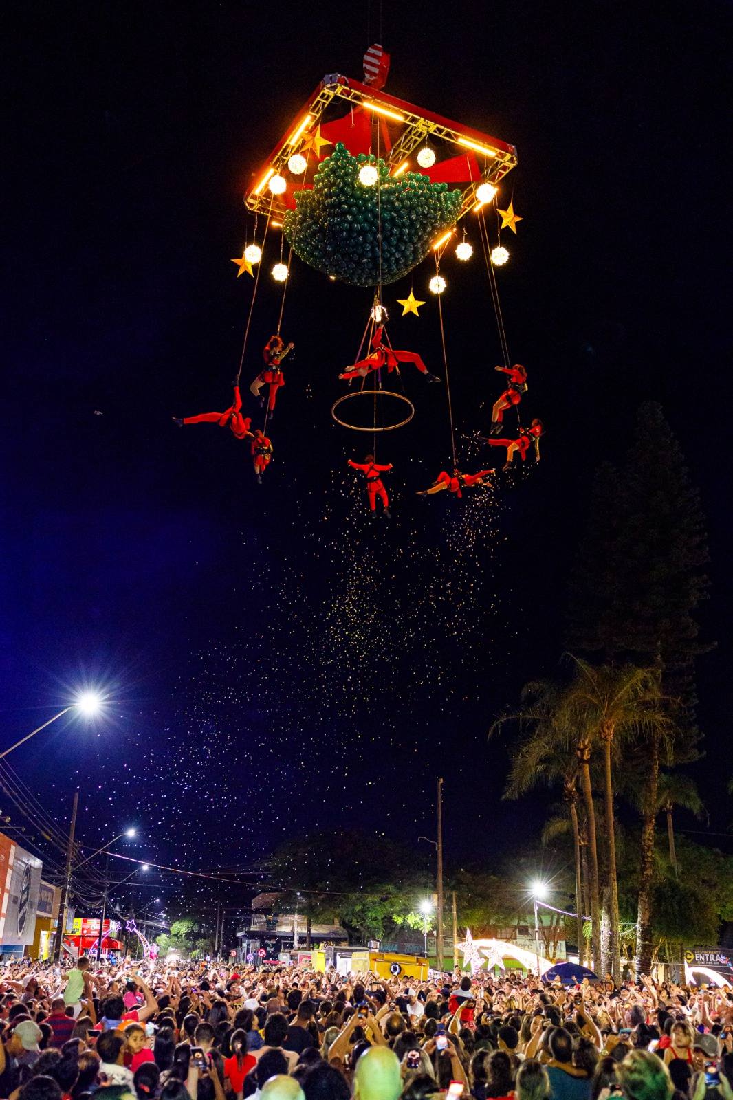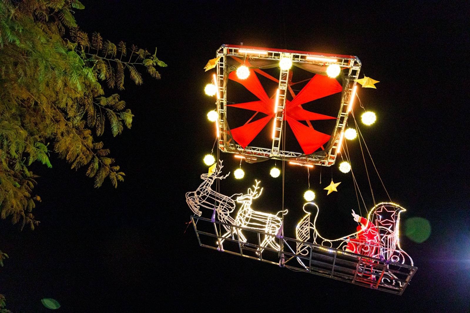 Içados por um guindaste, 10 acróbatas aéreos dançaram e apresentaram lindas coreografias, a uma altura de 40 metros do solo, enquanto músicas natalinas eram cantadas pelo Coral Ébano. Eles interagiram com o público e distribuíram doces e bolas.