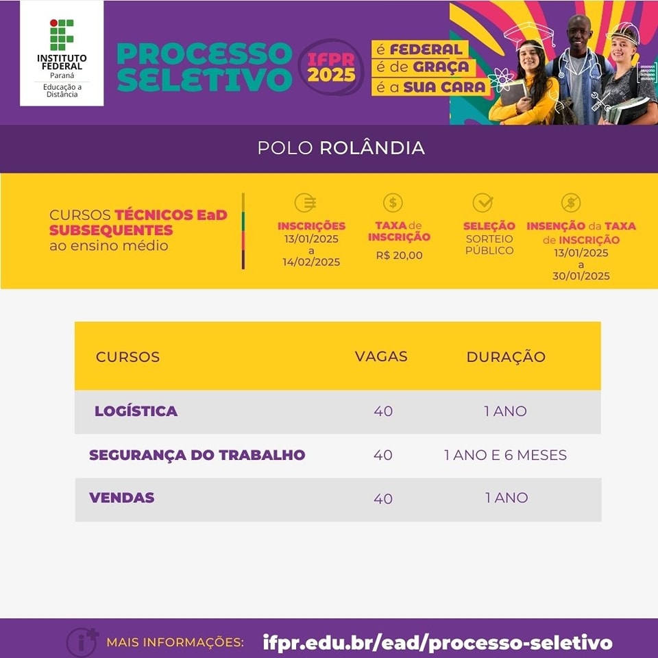 INSCRIÇÕES ABERTAS PARA CURSOS TÉCNICOS A DISTÂNCIA DO IFPR PARA MORADORES DE ROLÂNDIA   As secretarias de Desenvolvimento Econômico, Educação e Assistência Social firmaram parce...