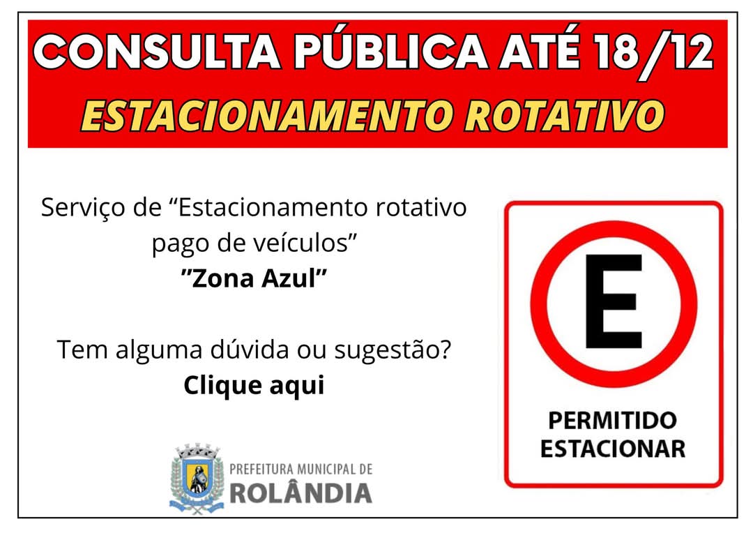População tem até 18/12 para opinar e sugerir sobre o projeto do estacionamento rotativo. Participe!   Na sexta-feira, dia 29 de novembro, a Prefeitura de Rolândia, por meio da secretaria de Desenvolvimento Econ&ocir...