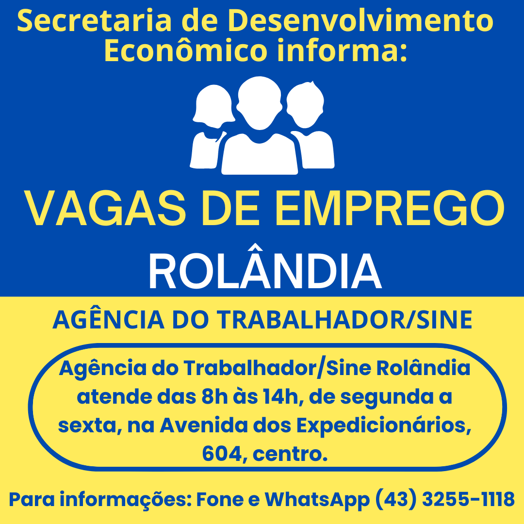 VAGAS DE EMPREGOS A Secretaria de Desenvolvimento Econômico informa que a Agência do Trabalhador/Sine Rolândia atende das 8h às 14h, de segunda a sexta, na Avenida dos Expedicionários, 604, centro. Atendimento ...