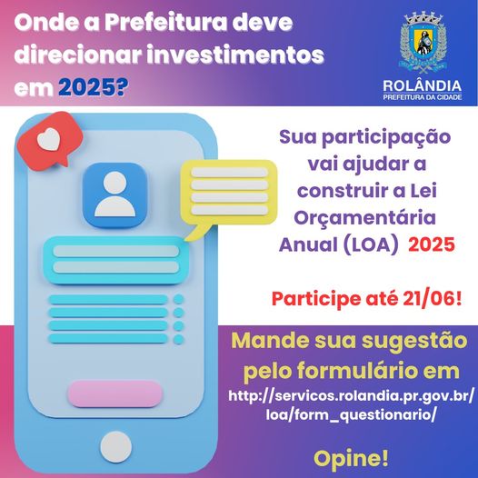 A Prefeitura de Rolândia, através da Secretaria Municipal de Finanças, por meio do Departamento de Orçamento, realiza a coleta de informações até 21 de junho (prazo prorrogado), das sugestões d...