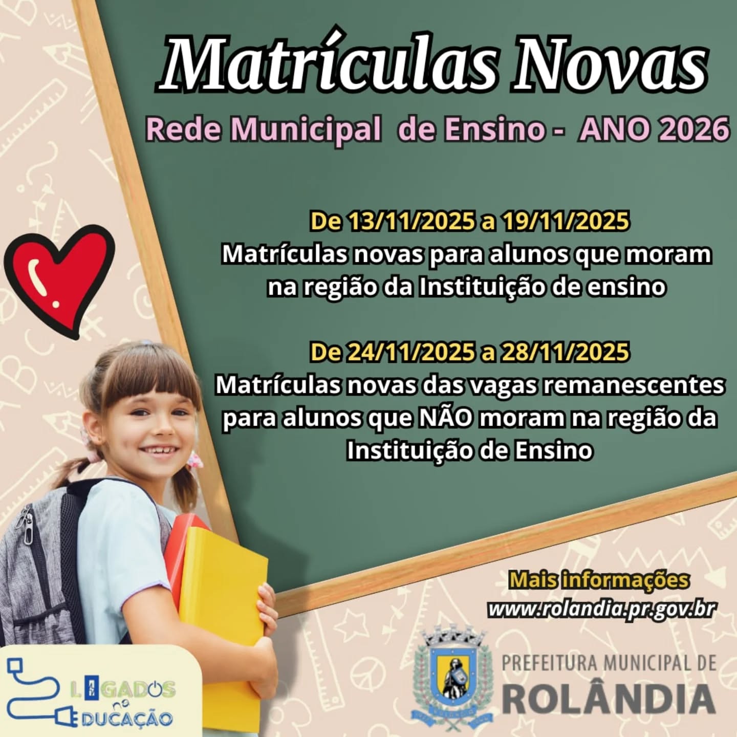 CRONOGRAMA PARA MATRÍCULAS NOVAS NA REDE MUNICIPAL DE ENSINO DE ROLÂNDIA A Secretaria Municipal de Educação, divulga cronograma para matrículas novas na Rede Municipal de Ensino de Rolândia. O respons&aac...