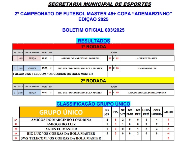SECRETARIA MUNICIPAL DE ESPORTES 2º CAMPEONATO DE FUTEBOL MASTER 45+ COPA “ADEMARZINHO” EDIÇÃO 2025 BOLETIM OFICIAL 003/2025 em anexo...