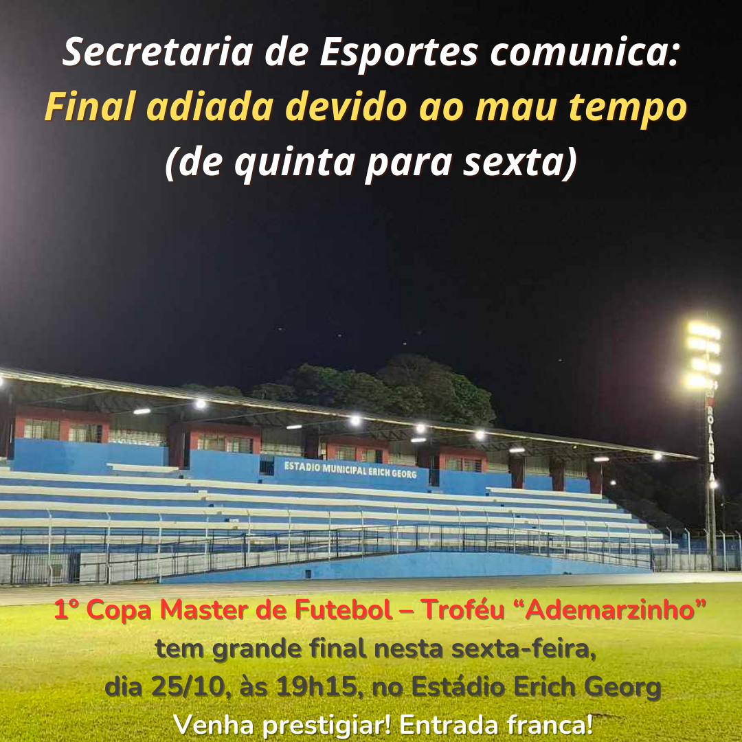 1º Copa Master de Futebol – Troféu “Ademarzinho” tem grande final nesta quinta-feira Depois de muitos gols, belos jogos e disputa equilibrada, a secretaria de Esportes convida a população para que venha pr...
