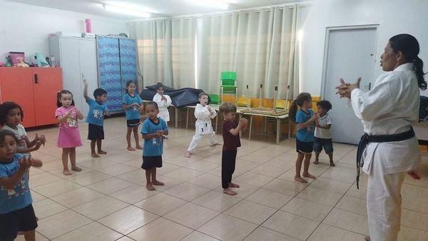 ALUNOS DO CMEI HANS HELMUTH BEHREND APRENDEM KARATÊ COM A SENSEI VERA O Centro Municipal de Educação Infantil (Cmei) Hans Helmut Behrend, no San Fernando, junto com a Academia Vera Karatê, da Sensei Vera Araújo, es...