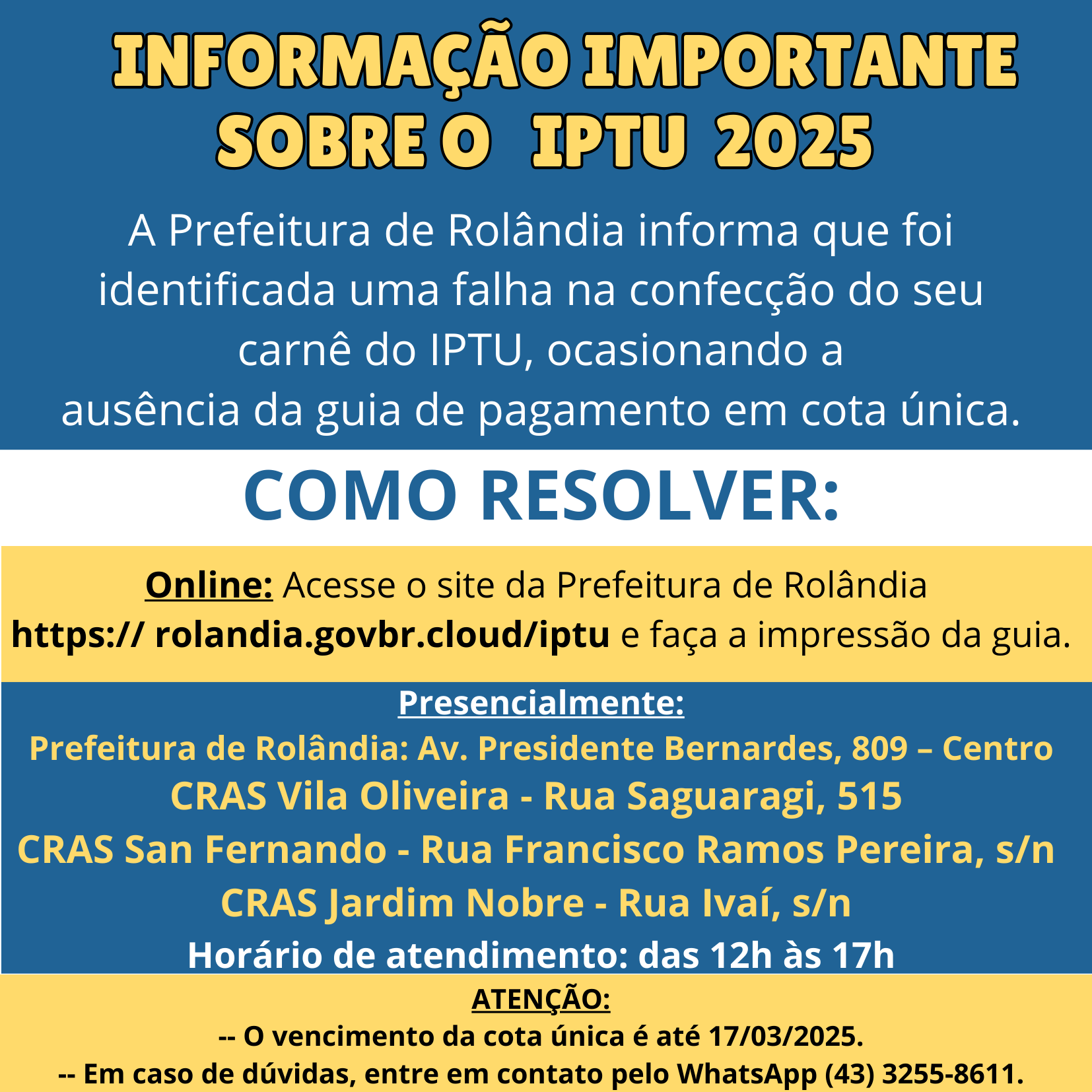 COMUNICADO IMPORTANTE AO CONTRIBUINTE DO MUNICÍPIO DE ROLÂNDIA A Prefeitura Municipal de Rolândia informa que foi identificada uma falha na confecção do seu carnê do IPTU, ocasionando a ausência da...