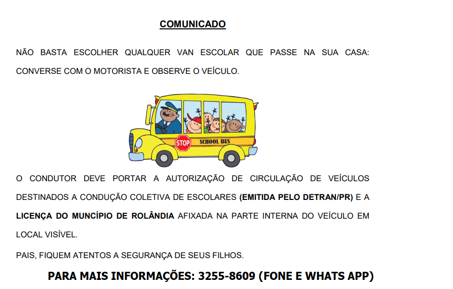 SECRETARIA DE FINANÇAS PEDE ATENÇÃO AOS PAIS E RESPONSÁVEIS QUE CONTRATAM O SERVIÇO DE TRANSPORTE DE ALUNOS! Dúvidas ou informações: Fone e Whats App (43) 3255-8609. ...