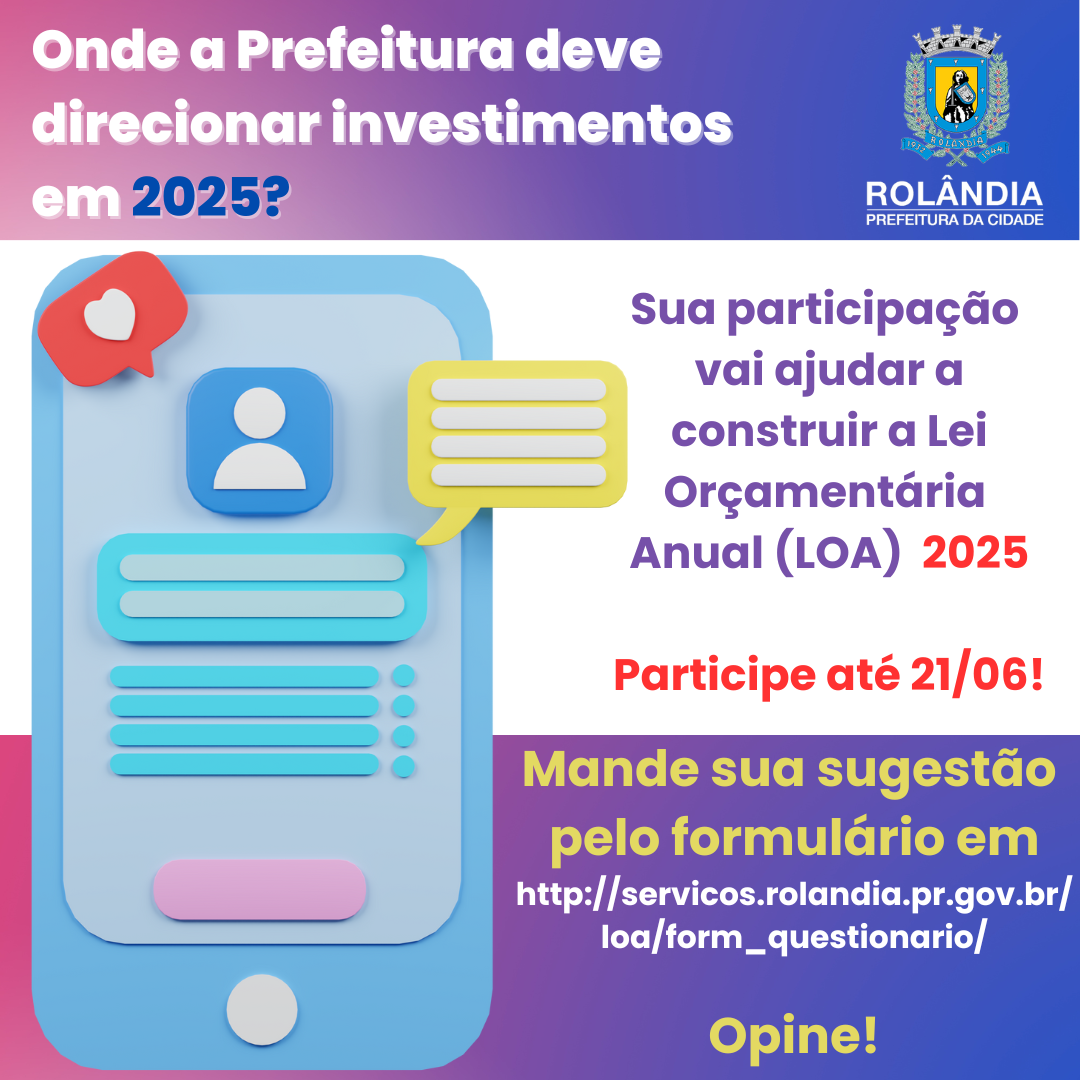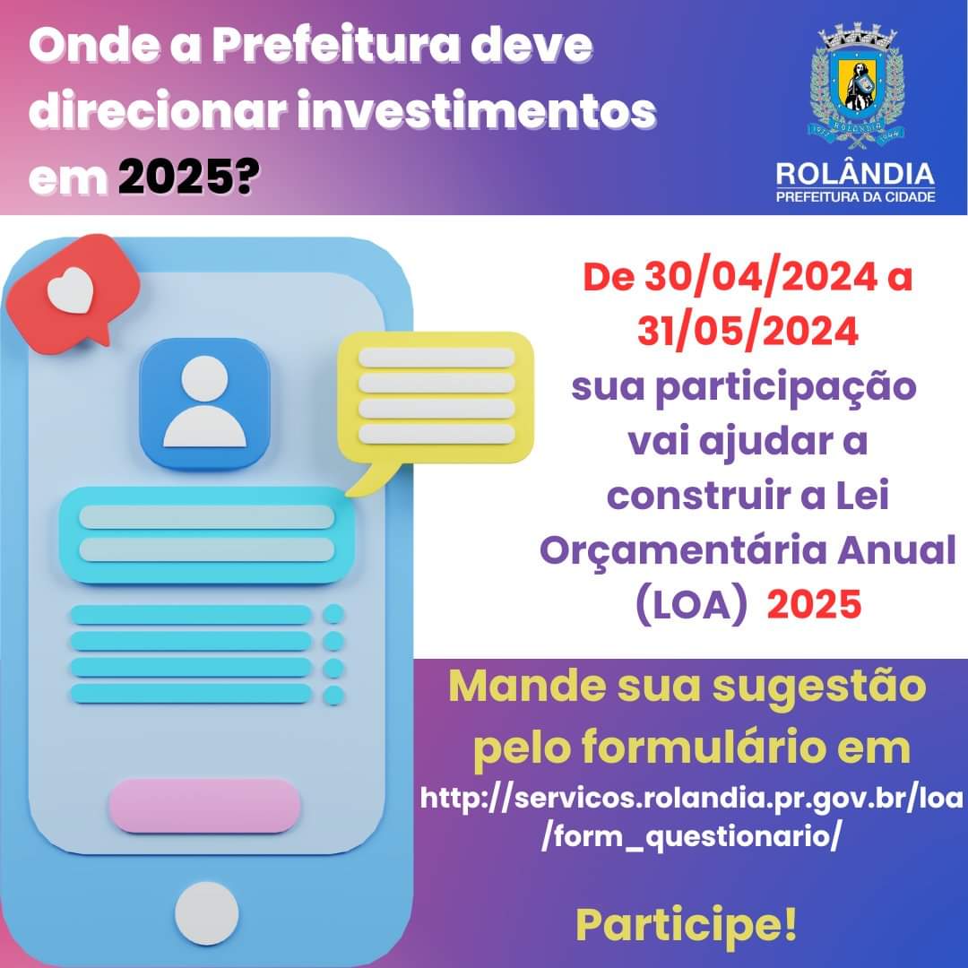 PARTICIPE DA CONSTRUÇÃO DA LEI ORÇAMENTÁRIA ANUAL (LOA) 2025 Até 31 de maio, os rolandenses podem colaborar com o desenvolvimento do Orçamento do município para 2025, trazendo sua sugestã...
