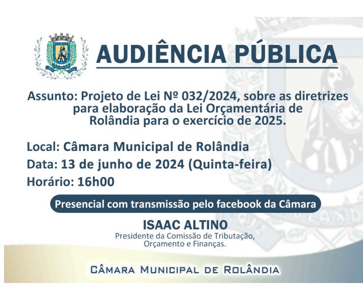 Audiência Pública do Projeto de Lei N.º 032/2024 A secretaria de Finanças informa que a Câmara Municipal, através da Comissão de Orçamento, Tributação e Finanças, realizar&aacu...