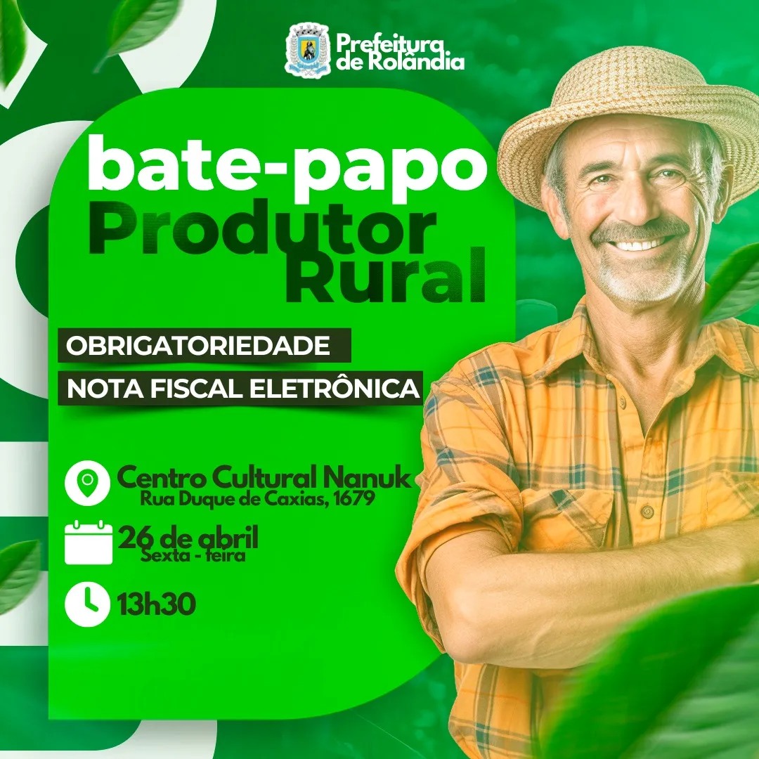CONVITE: BATE PAPO COM PRODUTOR RURAL SOBRE A EMISSÃO DA NFP-e   Obrigatoriedade da emissão passa a vigorar em 1º de maio em todo o país   A Prefeitura Municipal de Rolândia, atrav&eac...