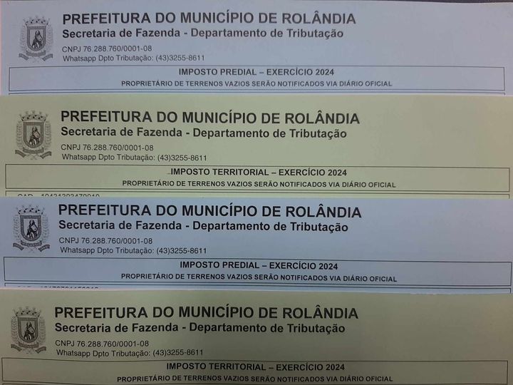 A secretaria Finanças informa que entregou 32.648 carnês do IPTU 2024.   Quem não recebeu, a segunda via está disponível pelo link: https://rolandia.govbr.cloud/iptu/    A taxa tem a corr...