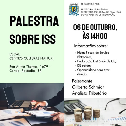 PALESTRA SOBRE O ISS NA SEGUNDA-FEIRA, NO CENTRO CULTURAL NANUK A secretaria de Finanças promove uma palestra sobre ISS (Imposto Sobre Serviços) direcionada a todos os contadores da cidade de Rolândia, abrangendo tanto os aut&oci...