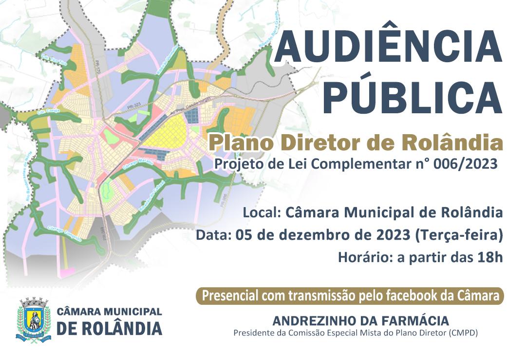 AUDIÊNCIA PÚBLICA DEBATE O PLANO DIRETOR A secretaria de Planejamento e a Câmara Municipal de Rolândia, comunicam e convidam para a Audiência Pública do projeto de lei complementar Nº 006/2023, que disp&oti...