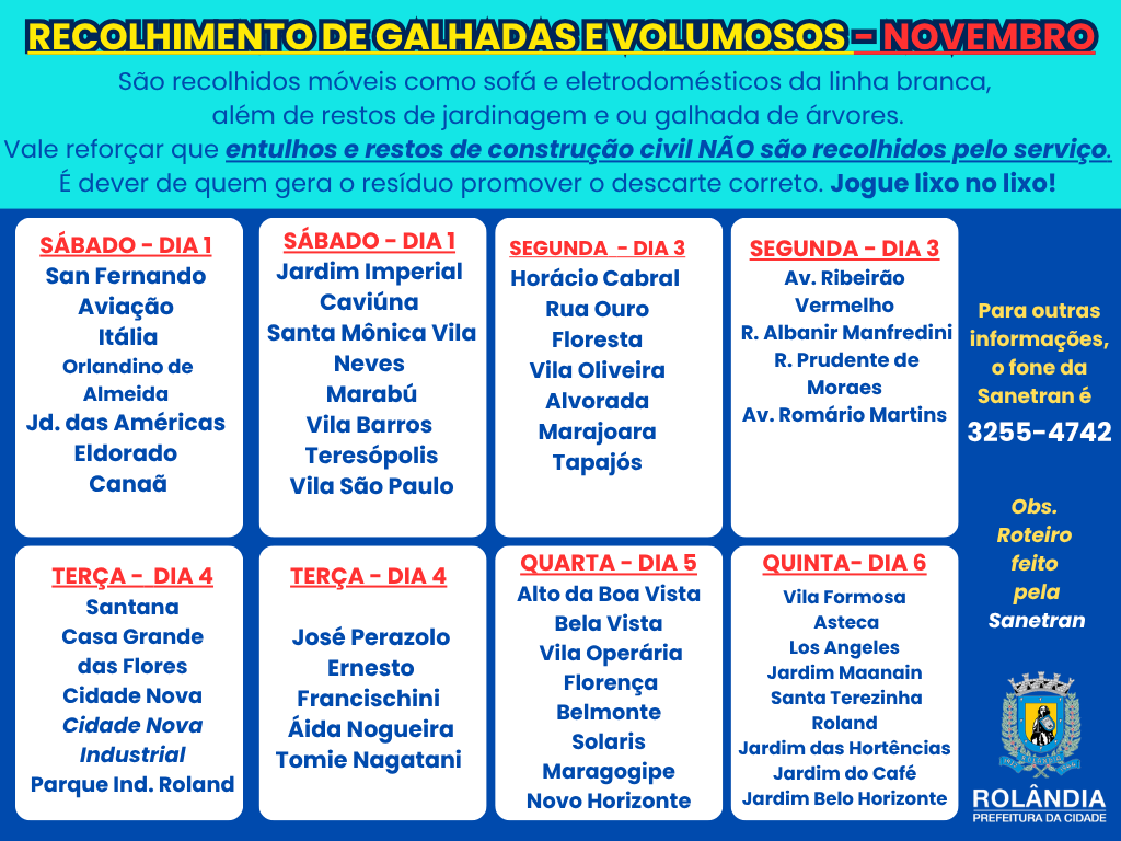 COLETA DE GALHADAS E VOLUMOSOS - NOVEMBRO   As Secretarias de Serviços Públicos e de Agricultura e Meio Ambiente informam que a empresa terceirizada que presta serviço ao município, a SANETRAN, passa recolhendo ...