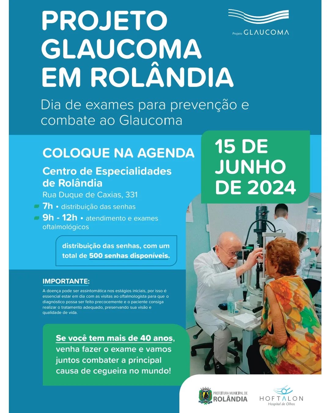 MUTIRÃO DE ATENDIMENTO EM SAÚDE DOS OLHOS NO DIA 15/06 No dia 15 de junho a população de Rolândia poderá participar do Projeto Glaucoma realizado pelo Hoftalon – Hospital de Olhos – no Centr...