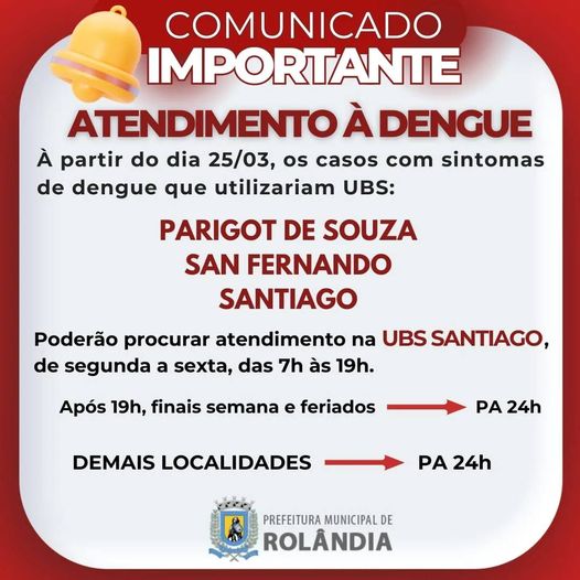 A secretaria de Saúde informa que, para melhor atender os pacientes com casos suspeitos ou confirmados de dengue, a partir desta segunda-feira, dia 25 de março, a ala nova da UBS do Santiago (Rua Alice Rocha, s/n, Jardim Santiago) vai...