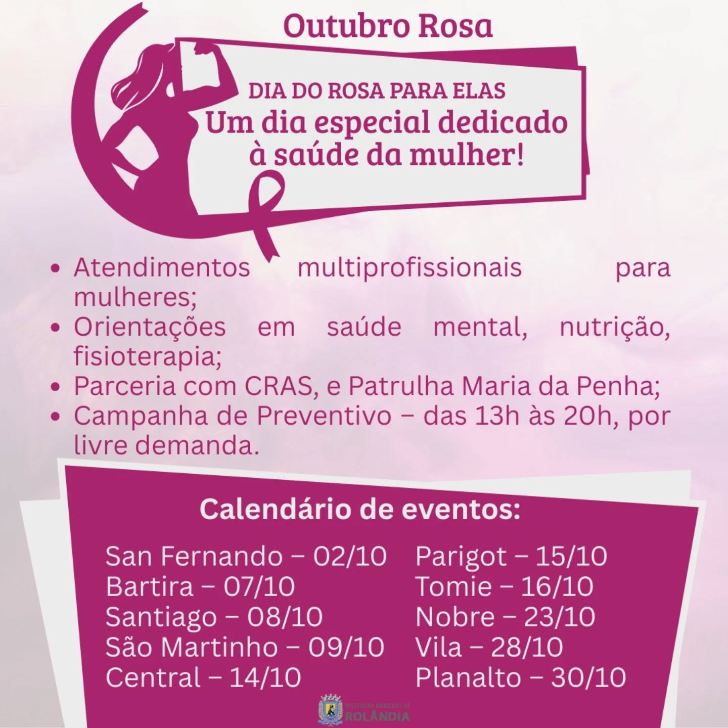 Outubro Rosa: Unidades Básicas de Saúde (UBS) vão atender em horários especiais e com serviços voltados às mulheres!   Quem tem entre 25 e 64 anos deve procurar a UBS mais perto da residênc...