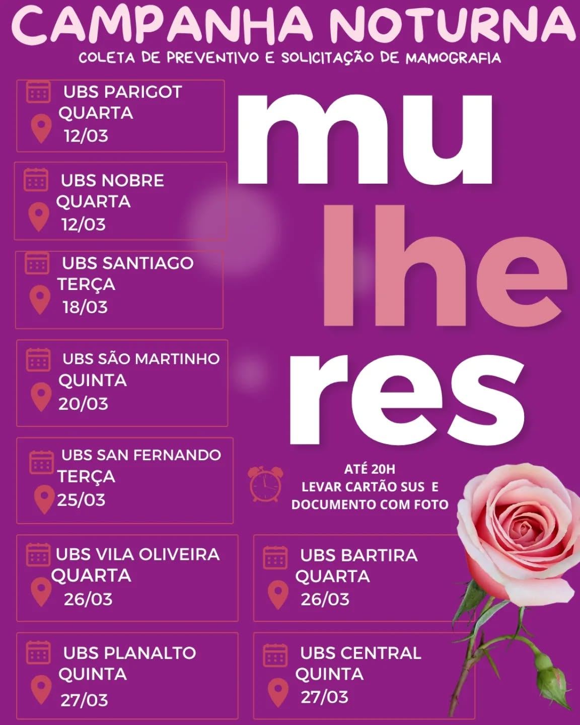 Mulher, cuide-se para cuidar de quem você ama!   Dentro do "Março Mulher", a secretaria de Saúde amplia o horário de atendimento de suas Unidades Básicas de Saúde para aumentar o alcance da campan...