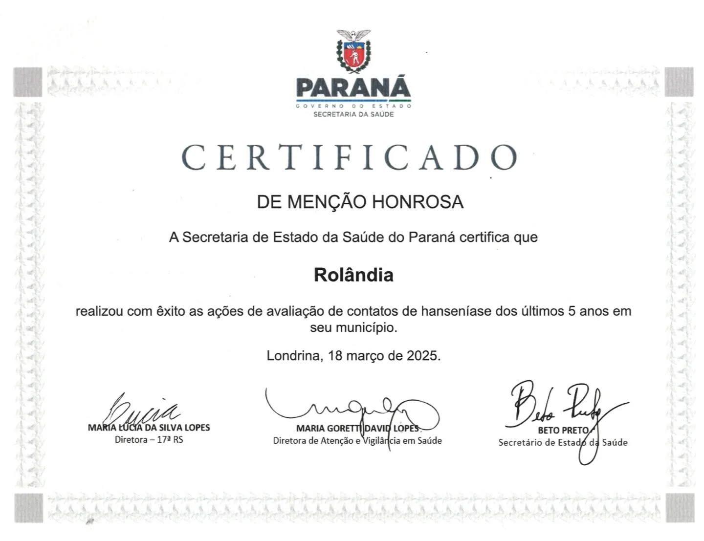 Município de Rolândia recebe menção honrosa da Secretaria de Estado da Saúde pelo trabalho no enfrentamento à hanseníase   A secretaria municipal de Saúde infotma que Rolândia ...