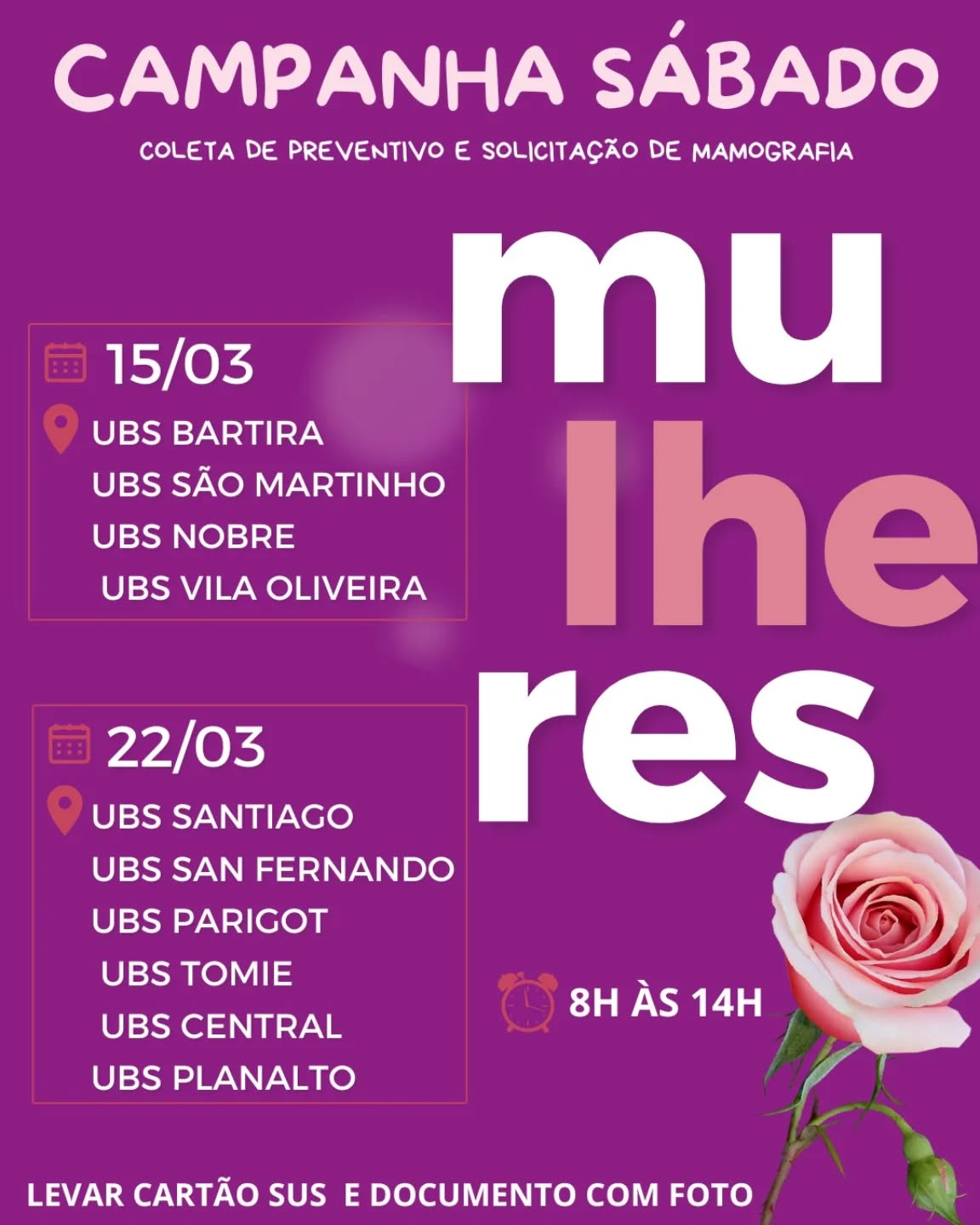 Mulheres, sábado é dia de cuidar da saúde!   Confira a nova programação, da abertura das Unidades Básicas de Saúde, das 8h às 14h!   Coleta de preventivo e agendamento de mam...