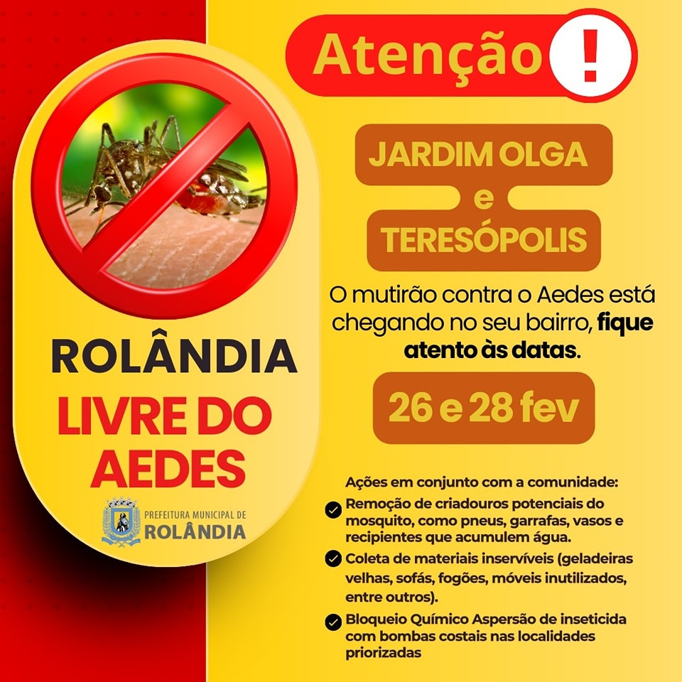 Rolândia unida contra a dengue!   A secretaria de Saúde promove, nesta segunda e terça, um mutirão contra o Aedes aegypti no Jardim Primavera e Ouro Verde.   Entre os dias 26 e 28 de fevereiro, a mob...