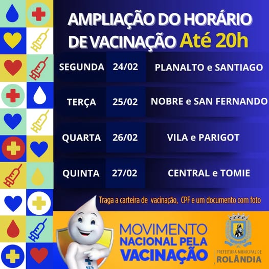 VACINAÇÃO COM HORÁRIO AMPLIADO!   A secretaria de Saúde informa que Rolândia participa do “Movimento Nacional pela Vacinação”. A ação tem foco prioritário na re...