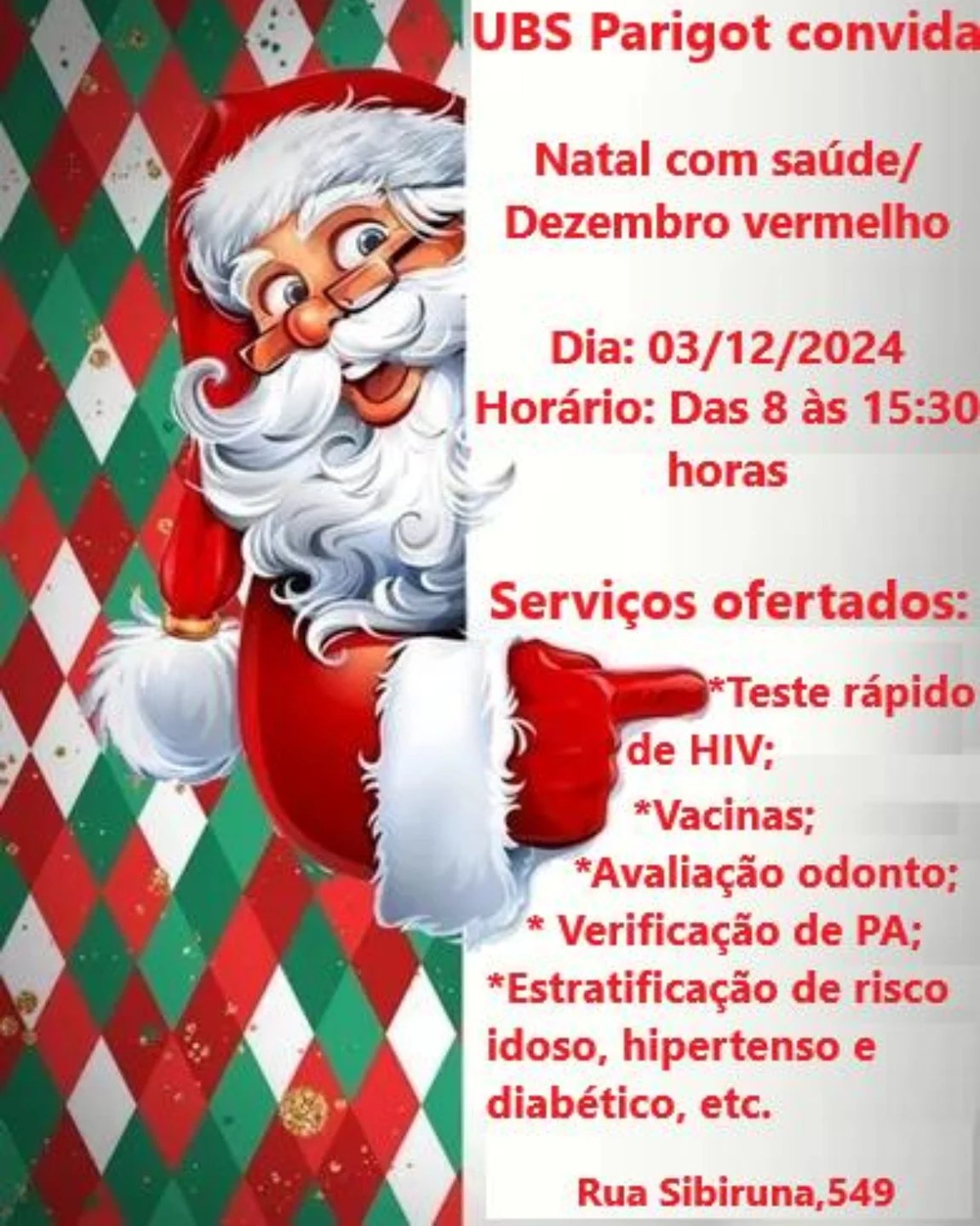 PAPAI NOEL ESTARÁ NESTA TERÇA NA UBS DO PARIGOT Nesta terça-feira, dia 3, além de todo trabalho especial para cuidar da saúde dos usuários, a equipe da UBS do Parigot informa que o "Papai Noel" vai estar n...