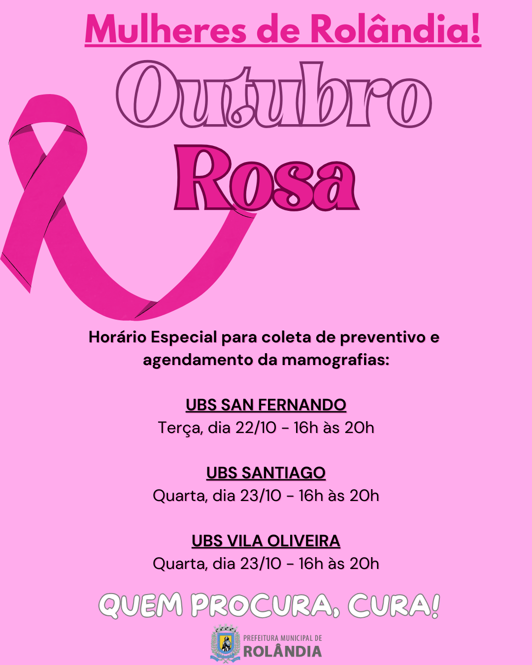 Mais de 400 mulheres passaram pelas UBS neste sábado! Neste sábado, dia 19 de outubro, a secretaria de Saúde informa que oito Unidades Básicas de Saúde de Rolândia abriram das 8h às 14h...