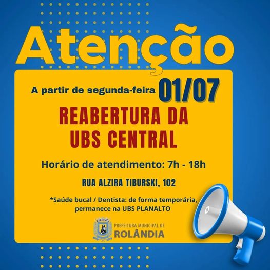 UBS CENTRAL VOLTA A ATENDER, NO TRADICIONAL ENDEREÇO, A PARTIR DE SEGUNDA-FEIRA A secretaria de Saúde informa que a partir desta segunda-feira, dia 1º de julho, a Unidade Básica de Saúde (UBS) Central volta a atend...