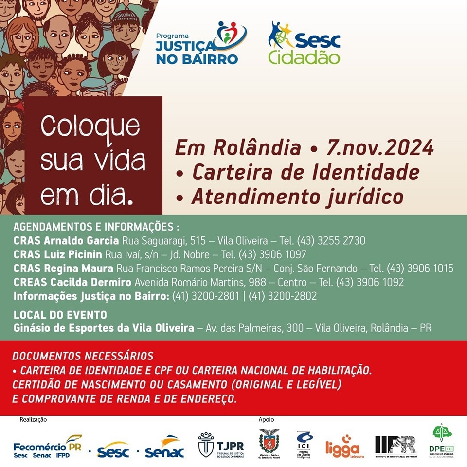 Justiça nos bairros/Sesc Cidadão em Rolândia, dia 07/11   Em parceria com o Tribunal de Justiça do Paraná, o Governo do Estado e o Sesc, a secretaria de Assistência Social comunica que Rolând...