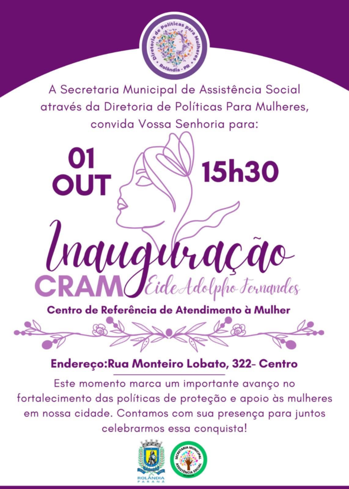 CRAM DE ROLÂNDIA SERÁ INAUGURADO NESTA QUARTA-FEIRA Nesta quarta-feira, dia 1º de outubro, 15h30, a secretaria de Assistência Social, por meio da Diretoria de Políticas para Mulheres, inaugura o Centro de Referên...