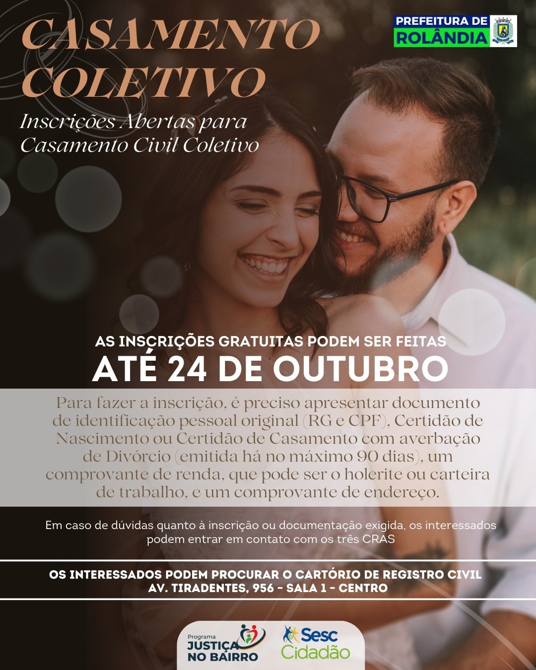 ABERTAS AS INSCRIÇÕES GRATUITAS PARA “CASAMENTO COLETIVO”   A secretaria de Assistência Social informa que estão abertas as inscrições para o Casamento Civil Coletivo.   Os inte...