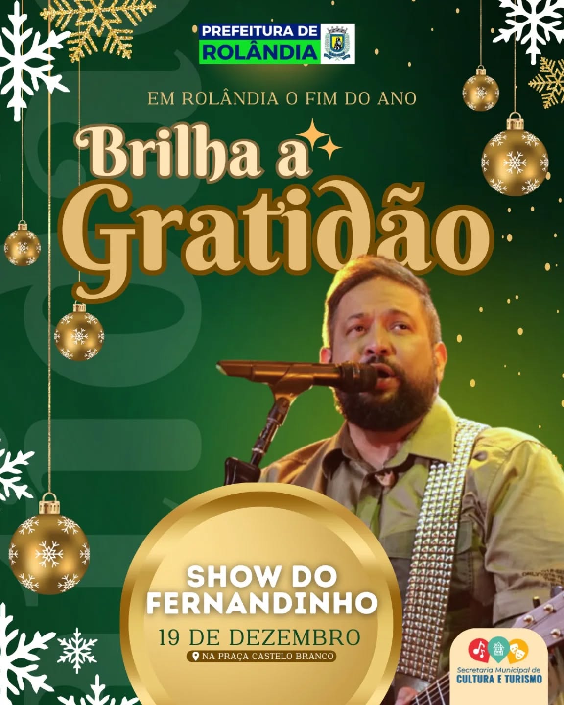 NATAL 2025 EM ROLÂNDIA: “BRILHA A GRATIDÃO” TERÁ SHOW COM O CANTOR FERNANDINHO   A secretaria de Cultura e Turismo comunica que está organizando as ações do Natal 2025. O tema deste ano se...