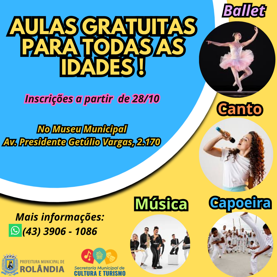 A PARTIR DE 28/10, SECRETARIA DE CULTURA E TURISMO RECEBERÁ INSCRIÇÕES PARA AULAS DE BALLET, CAPOEIRA, CANTO E MÚSICA A partir de terça-feira, dia 28 de outubro, a secretaria de Cultura e Turismo inicia as inscri...