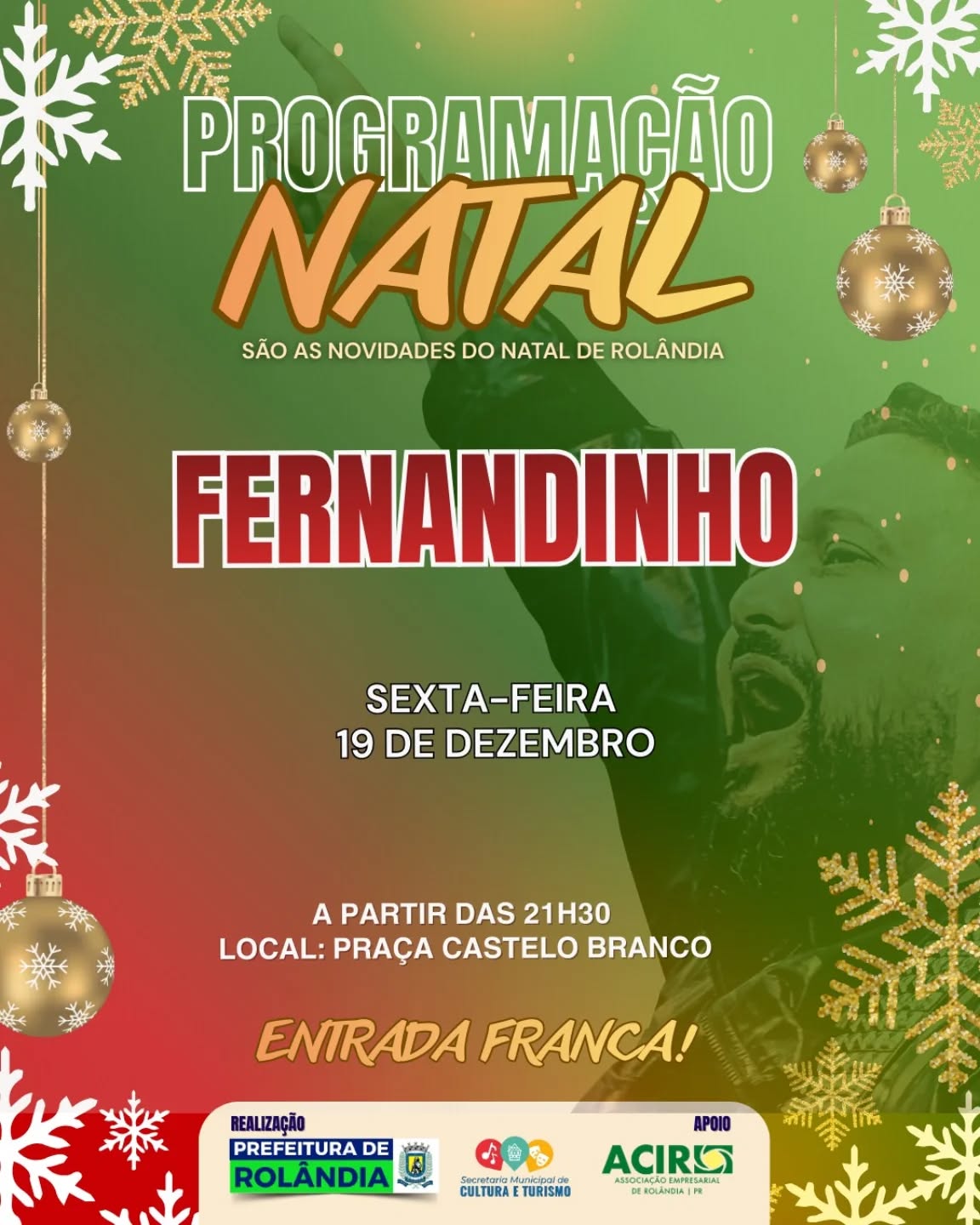 NATAL 2025 “BRILHA A GRATIDÃO” TERÁ SHOW COM O CANTOR FERNANDINHO A secretaria de Cultura e Turismo comunica que dentro das ações e atrações do Natal 2025 “Brilha a Gratidão”...