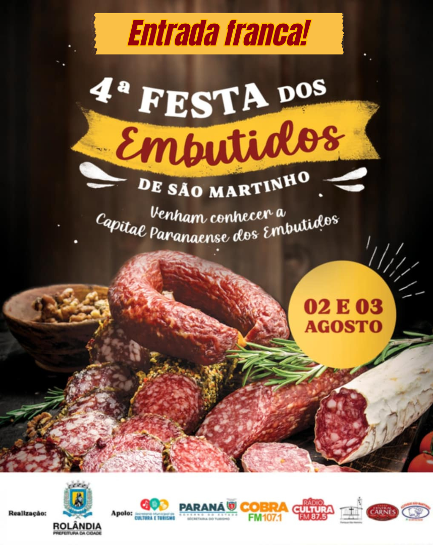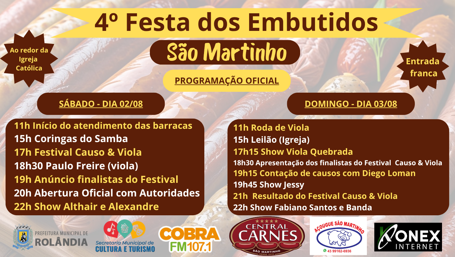 Secretaria de Cultura e Turismo divulga a programação oficial da "4° Festa dos Embutidos", no distrito de São Martinho!   Dias 2 e 3 de agosto!   Nos arredores da Igreja Católica do Distrito! &...