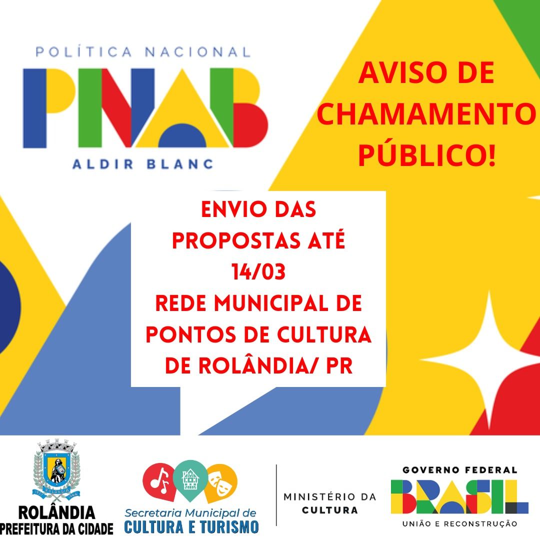ATENÇÃO, ENTIDADES CULTURAIS DE ROLÂNDIA!   Está aberto o Chamamento Público 01/2025, da Secretaria de Cultura e Turismo de Rolândia, executado com recursos da PNAB - Política Nacional Aldir...