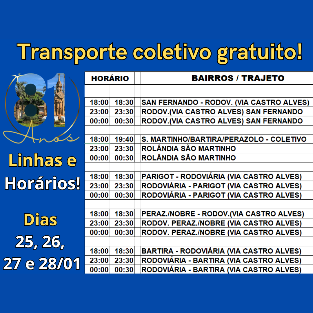 Transporte coletivo gratuito durante as festividades dos 81 anos de Rolândia. Aproveite!   REALIZAÇÃO --PREFEITURA MUNICIPAL DE ROLÂNDIA --SECRETARIA MUNICIPAL DE CULTURA E TURISMO   APOIO --GOVERNO DO PARAN...