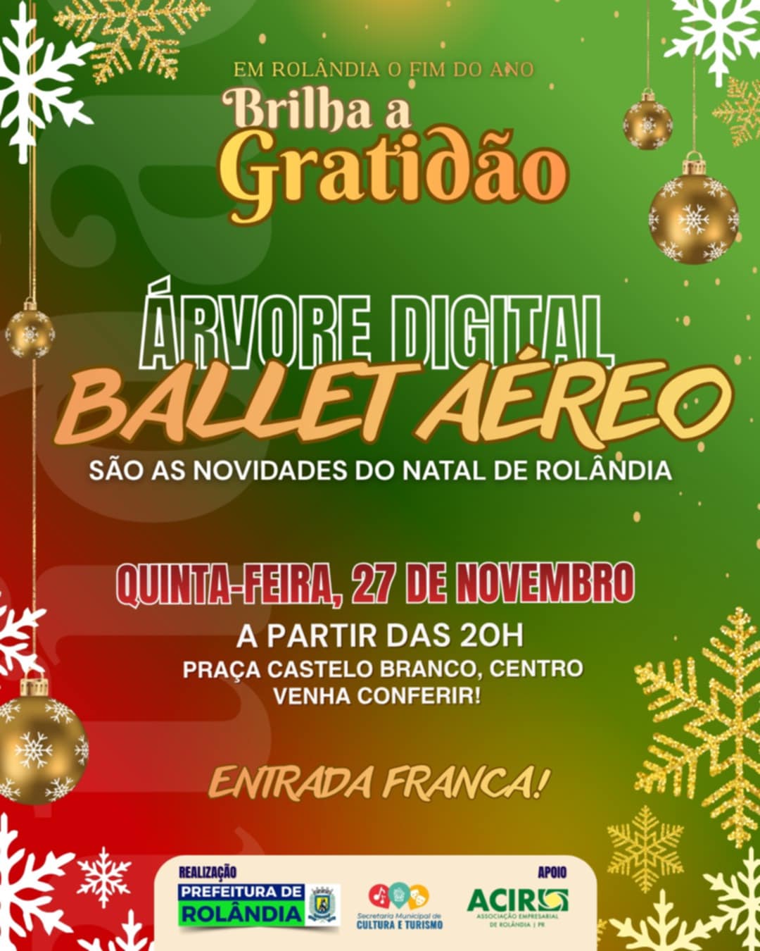 ÁRVORE DIGITAL E BALLET AÉREO SÃO AS NOVIDADES DO NATAL DE ROLÂNDIA “BRILHA A GRATIDÃO” Famílias de Rolândia, vocês estão convidadas! O Natal 2025 já tem data para c...