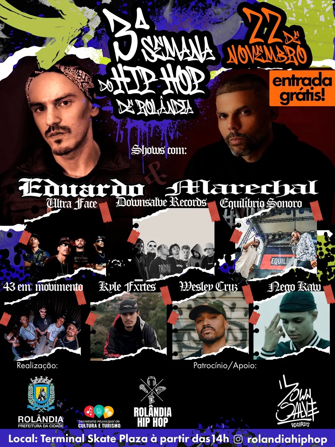 3° Semana do Hip Hop A cultura Hip Hop invade Rolândia em grande estilo! A 3ª Semana Hip Hop de Rolândia, com entrada GRÁTIS, movimenta a tarde e a noite deste sábado, 22 de Novembro! A partir das 14h ...