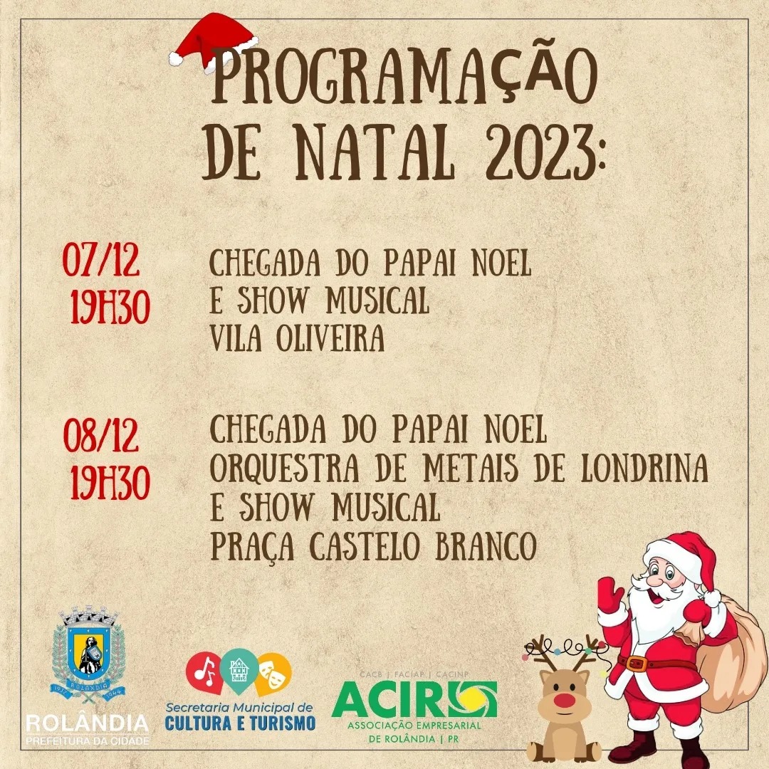 PROGRAMAÇÃO DO NATAL 2023! A Prefeitura de Rolândia, por meio da secretaria de Cultura e Turismo, e a ACIR divulgam a programação do Natal 2023! Prestigie! Venha e traga a família! ...