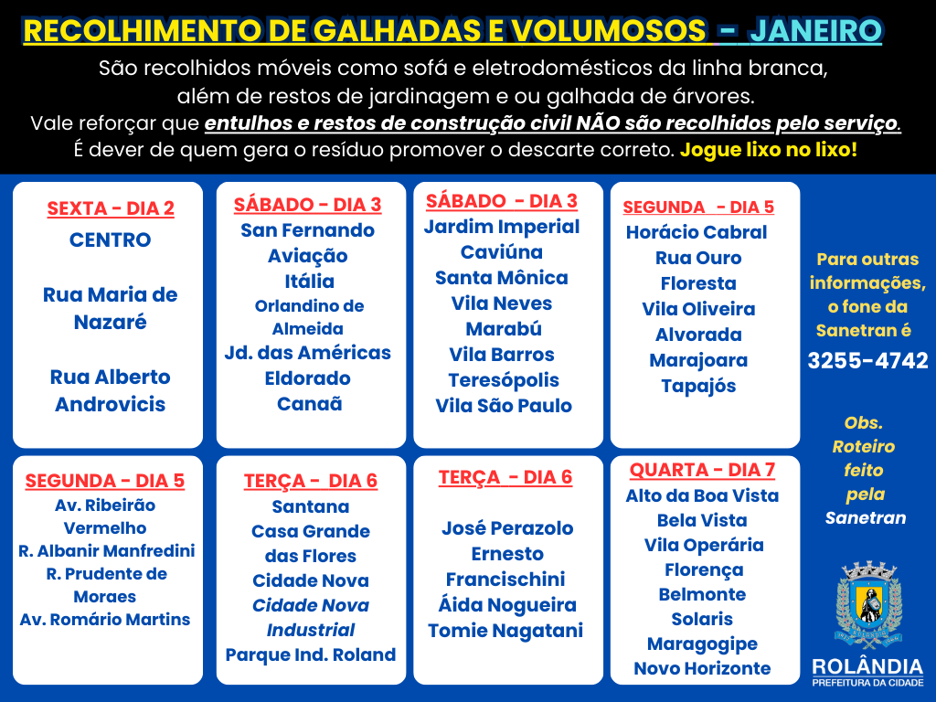 COLETA DE GALHADAS E VOLUMOSOS - JANEIRO As Secretarias de Serviços Públicos e de Agricultura e Meio Ambiente informam que a empresa terceirizada que presta serviço ao município, a SANETRAN, passa recolhendo volumosos d...