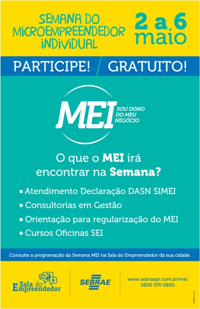 A Semana do Microempreendedor Individual (MEI) já está na oitava edição. O evento será realizado pelo Sebrae/PR, de 2 a 6 de maio, em parceria com as Salas do Empreendedor em todo o Paraná. Em Rolândia, o trabalho conta com o apoio do SINE/A...