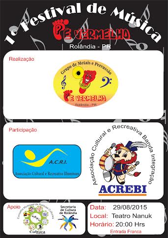 Neste sábado, 29 de agosto, a partir das 20h, no Centro Cultural NANUK, haverá o 1º Festival de Música Pé Vermelho. O evento é promovido pelo Grupo de Metais e Percussão Pé Vermelho de Rolândia e conta com o apoio da Secretária de...